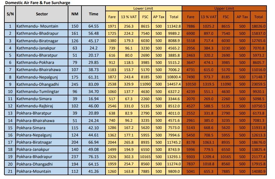 माउण्टेन फ्लाइटको भाडा न्यूनतम ११ हजार ४२ रुपैयाँ छ भने अधिकतम १८ हजार २६ रुपैयाँसम्म तोकिएको छ । यस्तै, काठमाडौं भद्रपुरको भाडा न्यूनतम ९ हजार ९८९ निर्धारण गरिएको छ भने अधिकतम १३ हजार ८३७ रुपैयाँ तोकिएको छ ।